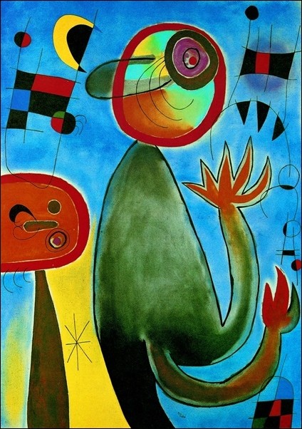 "Via his own Surrealism-inspired exploration, Miró invented a new kind of pictorial space in which carefully rendered objects issuing strictly from the artist's imagination became juxtaposed with basic, recognizable forms. His use of interior emotion to drive abstract expression would become a great influence on the Abstract Expressionists.Even though he pared his forms to abstract schematics or pictorial signs and gestures Miró's art never settled into complete non-objectivity. Rather, he devoted his career to exploring various means by which to dismantle traditional precepts of representation.Miró balanced the kind of spontaneity and automatism encouraged by the Surrealists with meticulous planning and rendering to achieve finished works that, because of their precision, seemed plausibly representational despite their considerable level of abstraction.Miró often worked with a limited palette, yet the colors he used were bold and expressive. His chromatic explorations, which emphasized the potential of fields of unblended color to respond to one another, as well as his flat backgrounds with mild gradations of color, were valuable resources, providing inspiration for Color Field painters such as Helen Frankenthaler.Miró was a modern renegade who refused to limit himself to visual exploration in a single medium. While he explored certain themes such as that of Mother and Child repeatedly throughout his long career, he did so in a variety of media from painting and printmaking to sculpture and ceramics, often achieving surprising and disparate results."(theartstory.org)\
